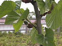 昨年植えた桑の実に実がなっていた。でもまだ見た目が毛虫のようでなんだかちょっと気持が悪い。もう少しするとトゲトゲが目立たなくなって美味しそうになるのであろう。父が別のところから桑の実を取ってきたので食べてみた。多分初めての体験である。甘酸っぱいような味はまあまあであったが、もう少し甘くてもいいような気もする。弘彦はたいそう気に入ったらしく口のまわりや指が紫色に染まっていた。これじゃ桑の実を食べたことがすぐにみんなに分かってしまうのであった(^^♪ |