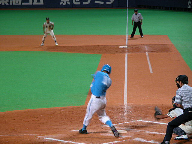 8時から試合が開始されたが、昨日の酒が残っているせいか体調が悪い。きょうもランナーコーチで声援を送った。3回表にAさんのタイムリーヒットで1点を返して2対4となりこちらが押せ押せムード。4回には2アウト満塁のチャンスを作ったがここで点を取れなかったのが響いた。その裏2点を入れられ、最後にダメ押しのソロホームランを浴びて万事休す。最後の回に代打として出してもらったが4球目を中途半端なバッティングでファーストのファールフライに打ち取られがっくり。結局2対7で負けてしまった。でもなかなか面白いゲームになってよかった。チームのメンバーも明るくていい人ばかりだったのでまた一緒にやりたい。来年はレギュラーでフル出場できるようにがんばるぞ(^_^)/~ |