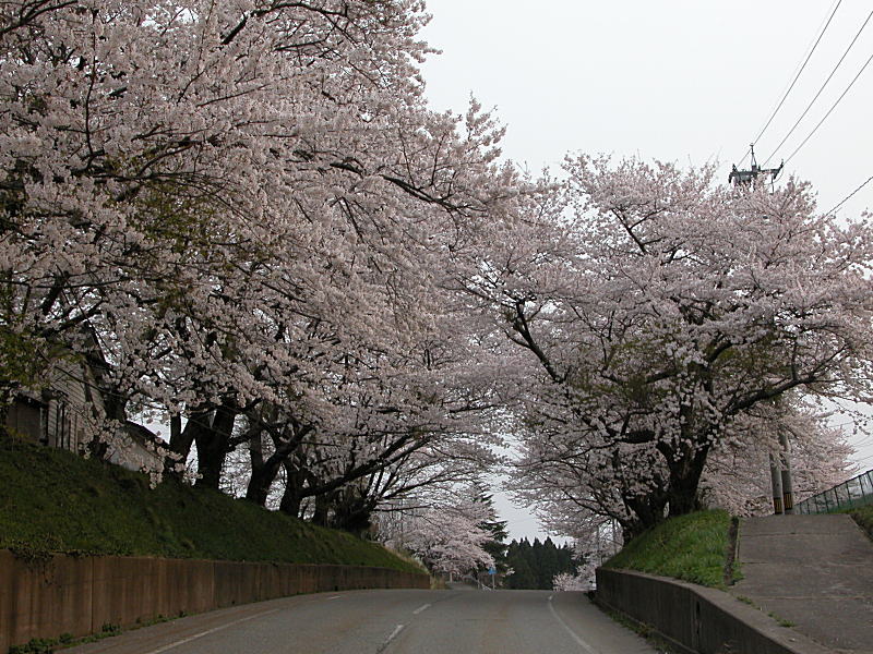 国道471号線の上に覆いかぶさるようにして桜が咲き誇る。しかし、放牧場なので、花見をするにしては、少し匂いが気になるのが難点か。 |