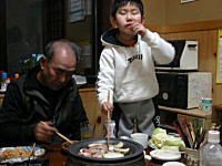 今日の夕ご飯は焼き肉。焼き肉や鍋のときは大体じいちゃんが仕切るのであるが、焼く・燃やすと聞けば弘彦も黙ってはいない。いろりや火鉢で火を燃やすことが大好きな弘彦は、焼き肉でもすすんでお手伝い?邪魔をしているのか手伝っているのか不明であるが、長い箸で野菜をメインに焼いていた。そういえば最近いろりで火を燃やしていないなぁ。いろりの部屋は玄関に面しており、古い家なのですきま風も多く寒いので、ついついおっくうになってしまうのである。でも火を見ていると心が落ち着くというか、何ともいえないいい気持ちになる。煙の匂いもなかなかいいものである。2階の寝室まで煙が上がってくるのが難点であるが・・・。 |