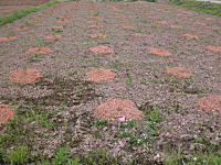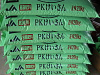 田に「PKけいさん」を散布した。これを散布すると稲体が強くなり、倒伏や病害虫の発生防止に効果があるといわれている肥料である。先日開催された稲作現地検討会でも紹介されていたのであるが、父に聞いたところ、いままで散布したことはないとのことであった。昨年はコシヒカリが倒伏した苦い経験があるので、今年は「PKけいさん」の効果を試してみようと、一部の田に散布してみたのである。この肥料は、10a当たり40kg(2袋)も散布しなければならず、1袋の値段は2,121円もする。果たしてその効果やいかに(ーー;) |