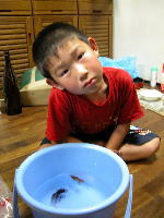 当然弘彦が「釣りをしたい」と言い出して駄々をこねるので、能美市にある手取フィッシュランドの釣り堀へ行った。鯉の釣り堀が1時間1,000円。何回も餌だけとられ、結局1匹だけ釣り上げることができた。続いて金魚すくいを2回。うなき釣り、ザリガニ釣りを各1回づつした。釣れなくても持ち帰りさせてくれるので、ザリガニが1匹、金魚が4匹が我が家にやってきた。でも世話をするのは結局嫁さんになってしまうのであろう(^_^) |