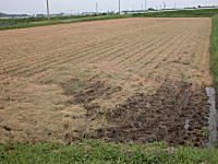 明日「ゆめみずほ」の稲刈りをする予定なので、事前にその田を見に行った。するとコーナーの1箇所が水が溜まっていて柔らかくなっていてコンバインがハマリそうな状態になっていた。暗渠が入っているので水はけが良いはずのだがどうしたことだろう?仕方なくハマリそうなところを全部手で刈ったところ1時間ほどかかってしまった。残暑厳しく疲れたー(>_<) |